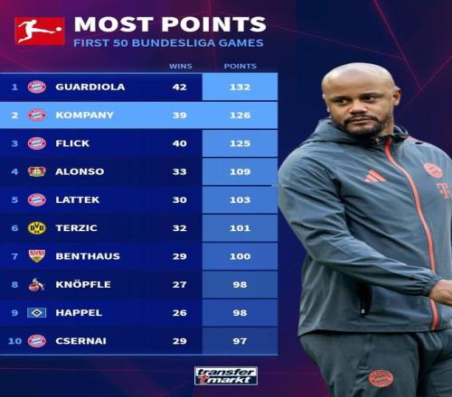 孔帕尼执教德甲前50场126分,历史仅次于瓜迪奥拉