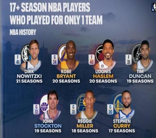 北京时间今日,美媒晒出了NBA历史上“一人一城”17+赛季的球员,诺维茨基成为历史上该统计生涯最久的球员,库里则是唯一一个现役球员。