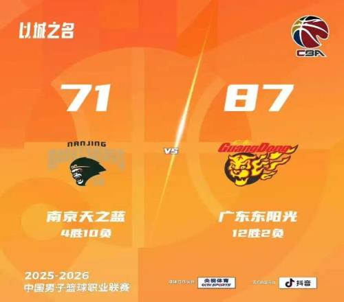 末节决战,郭昊文三分手起刀落,胡明轩突破再打2+1。郭昊文、陈家政对飙三分,马内克两罚中一,萨林杰借掩护下顺劈扣。球队暂停回来,郭昊文远投再度开火,,赵柏清弧顶强势3+1打成将分差缩小至个位数。萨林杰、萨姆纳先后登场,在进攻端接连打进,胡明轩再度三分命中,郭昊文内线搏得犯规两罚中一。王少杰禁区吃饼,杜润旺三分再中。赵柏清、刘奕杭接连命中两罚。全场比赛结束,南京天之蓝71-87广东东阳光。