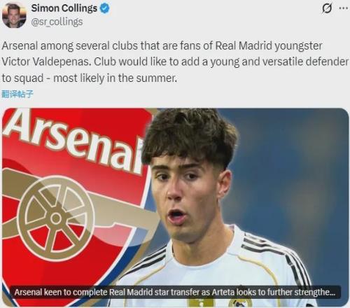 太阳报记者SC消息(原晚旗报跟队记者),阿森纳正密切关注维克托-巴尔德佩尼亚斯,这名19岁的新星上个月刚刚代表皇马完成了一线队首秀,并且他同时引起了很多欧洲顶级俱乐部的兴趣。