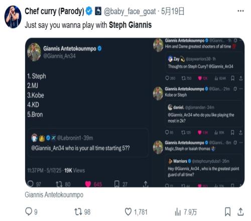 篮球资讯05月20日宣 字母哥近日在推特上跟网友进行了互动,互动中,字母哥多次提到了勇士球星库里。